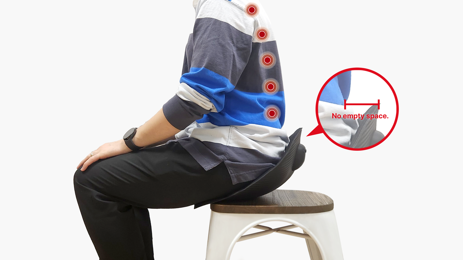 When you sit fully back on the seat, your pelvis naturally makes contact with the raised rear rim. This contact allows the seat’s curved shape to create a gentle lifting effect, guiding the pelvis into a more neutral position. Once the pelvis is aligned, the lower back can settle into its natural curve, the chest opens, and the shoulders fall into a more balanced position.